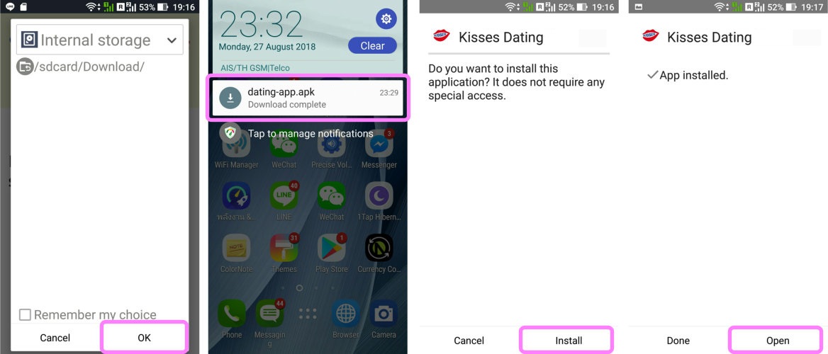 After the download is finished the phone will ask if you want to install the App or you have to go to the download bar and´double click on it to start the installation. download-mobile-dating-app